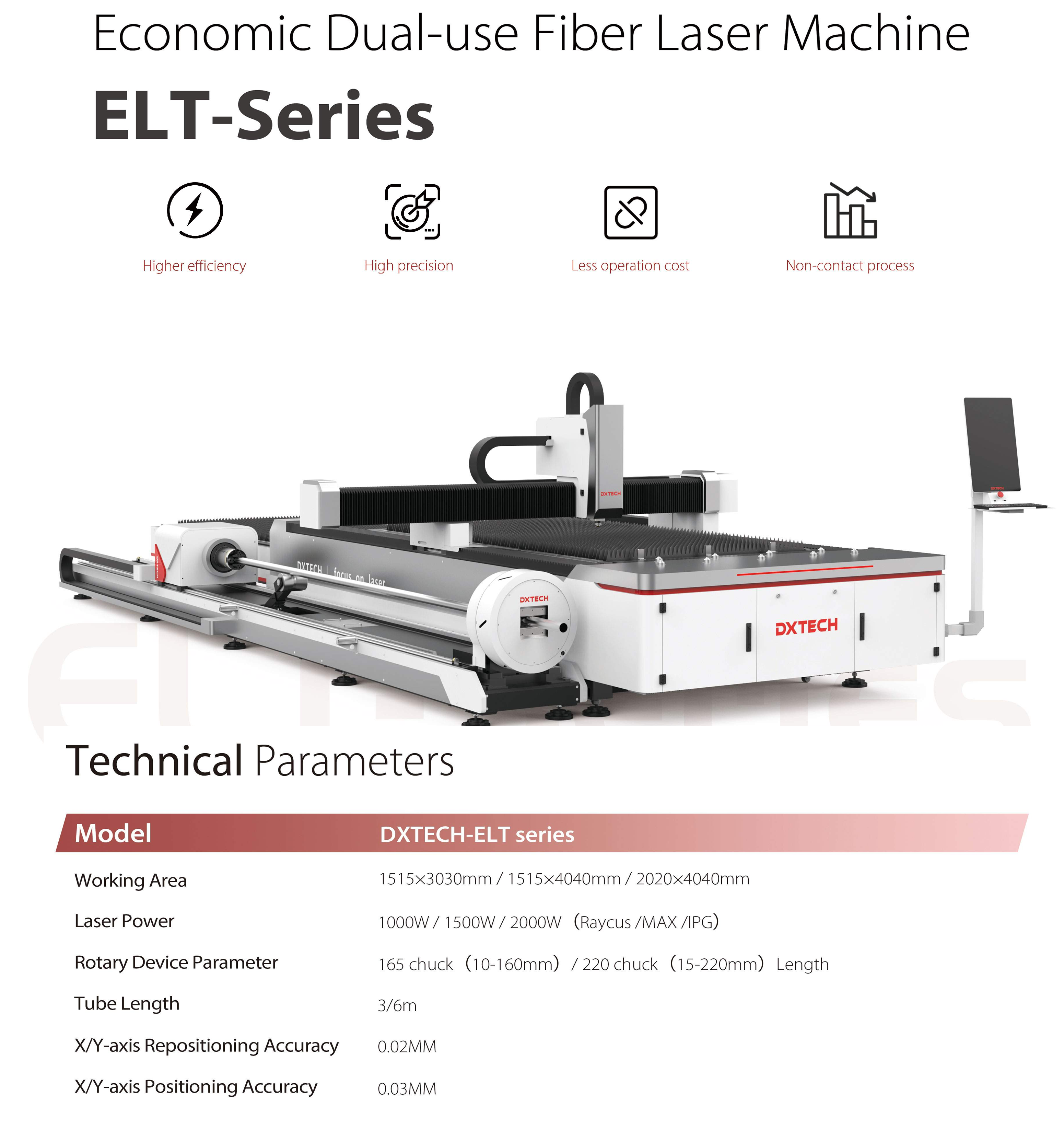 The ELT Series Laser Cutter is our FLT Series Laser Table with a Tube Cutting Extension and Exchange Table option made for an excellent dual purpose high capacity machine.